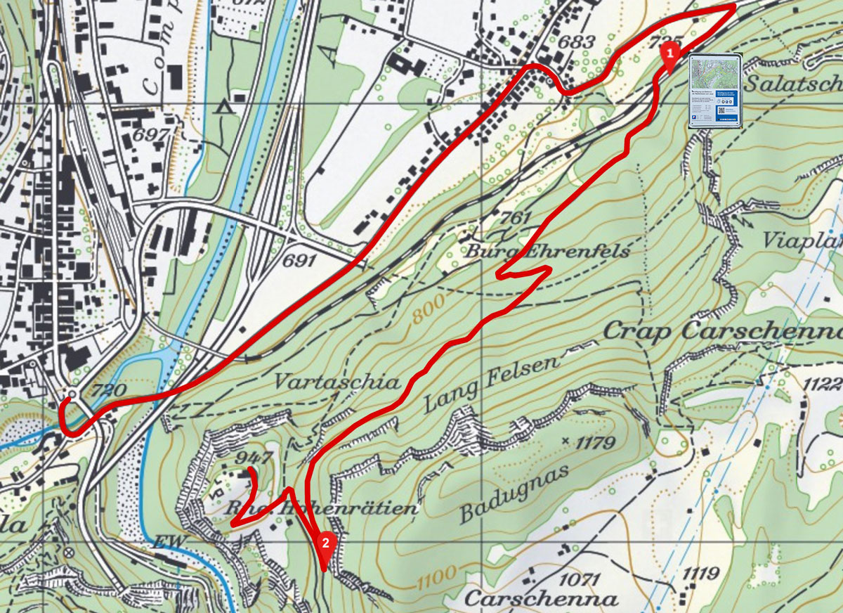 Das Fahrzeug am Bahnhof Sils (#1) parkieren. Auf der Seite jenseits des Geleises GRATIS. Hier steht die Tafel zum Lösen einer Fahrbewilligung für die Carschennastrasse. Bitte den PP Caltscheras (#2) benützen.